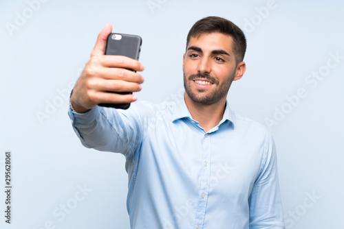 adult, background, beard, blue, camera, casual attire, caucasian, mobile phone, cellular, cool, digital, expression, face, gesture, good, guy, photogenic, happiness, happy, hispanic, holding, isolated, laugh, male, man, man, mobile, modern, people, person, phone, photo, photo, picture, portrait, positive, proud, slim, smile, technology, phone, wall, young