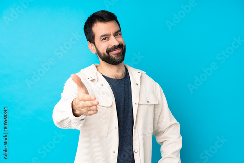 Young handsome man with white corduroy jacket over isolated blue background shaking hands for closing a good deal