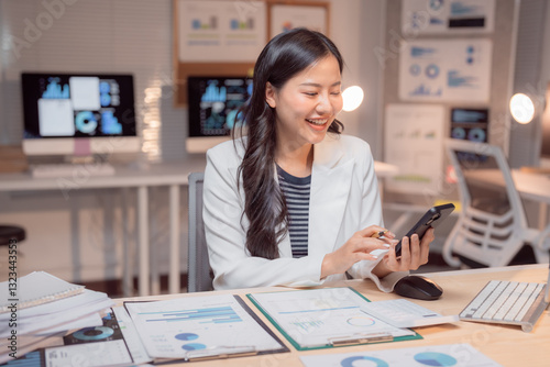 business, businesswoman, asian, woman, office, working, finance, financial, datum, analysis, analysing, smartphone, calculating machine, technology, computer, desk, document, graph, chart, report, accounting, accountant, job, career, professional, success, successful, happy, smiling, night, late, work, workplace, corporate, company, businessperson, executive, manager, entrepreneur, startup, growth, strategy, planning, investment, money, earning, profit