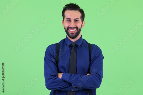 businessman, persian, young, people, portrait, middle, eastern, beard, photogenic, 20s, man, male, man, guy, adult, person, moustache, attractive, studio, shot, isolated, green, background, screen, chroma key, business, corporate, executive, entrepreneur, suspenders, blue, happy, happiness, smile, smiling, arm, crossed, confident