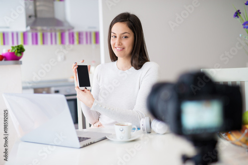 Young happy beautiful girl is sitting at the kitchen table and showing the phone to the camera with laptop in front of her while drinking coffee.