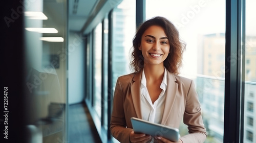 Young happy businesswoman using digital tablet while standing by the window in the office and looking at camera. Copy space.