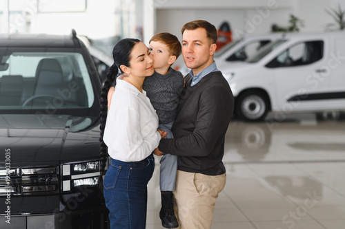 Young happy family enjoying while buying a new car in a showroom
