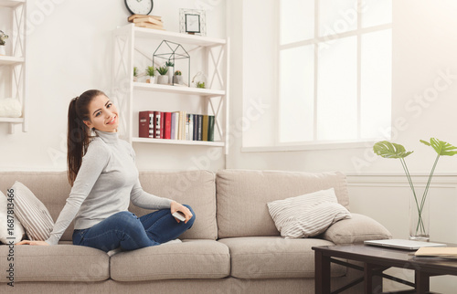 Young happy girl with smartphone, sitting on beige couch at home, smiling at camera, copy space