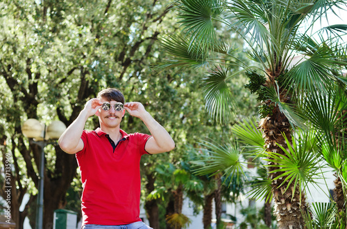 Young happy handsome bearded man, tourist walking in old city of Koper. Summer vacation. Sunglasses. Lifestyle portrait