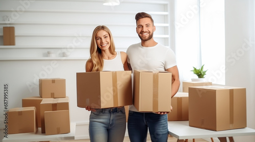 Young happy man and woman, in a new house after moving. Unpacking boxes after moving into a new apartment. New homeowners. Mortgage. Rental of property. Real state and move concept