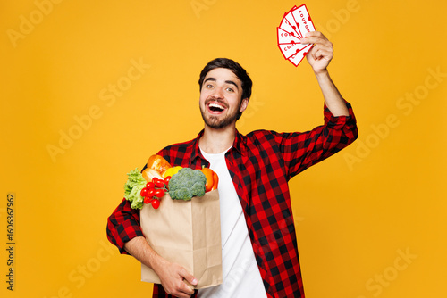 Young happy man wear casual clothes hold bag for takeaway mock up with food products gift coupon voucher card for store isolated on plain yellow orange background. Delivery service from shop concept.
