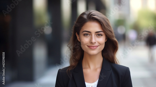 Young happy pretty smiling professional business woman, happy confident positive female entrepreneur standing outdoor on street, looking at camera