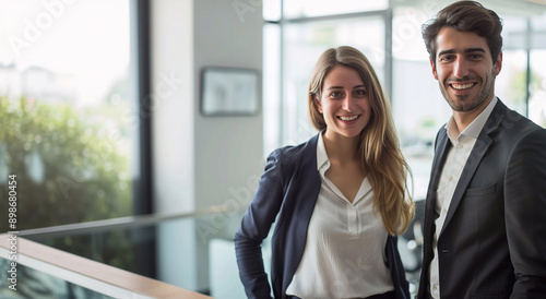 couple, businesswoman, businessman, business, smiling, office, partnership, happy, 2, female, adult, man, caucasian, portrait, woman, colleague, professional, male, people, entrepreneur, standing, teamwork, occupation, modern, positive, looking, manager, team, cheerful, young, company, successful, owner, technology, lifestyle, casual attire, cooperation, work, indoor, suit, confident, together, corporate, ai, generative, ready, plan, meeting, summer