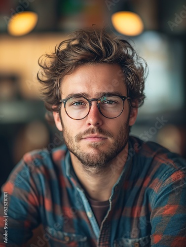 Young Hipster Man in Plaid Shirt Smiling at Coffee Shop. A Modern Portrait with Natural Light and Positive Vibes