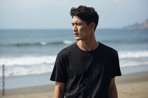 Young hipster man wearing a black blank t-shirt standing at the beach with sky and sea the ocean background. Generative AI.