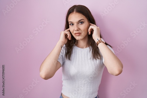 Young hispanic girl standing over pink background covering ears with fingers with annoyed expression for the noise of loud music. deaf concept.