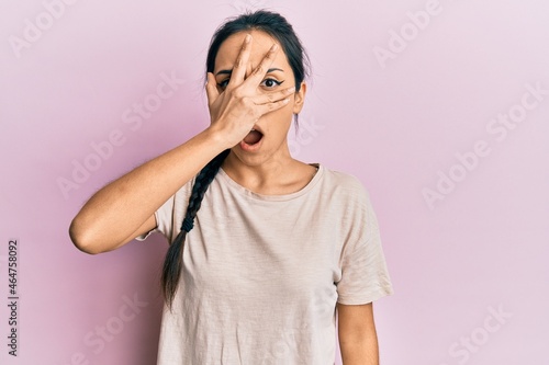 Young hispanic girl wearing casual white t shirt peeking in shock covering face and eyes with hand, looking through fingers afraid