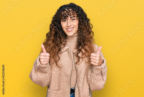Young hispanic girl wearing winter clothes success sign doing positive gesture with hand, thumbs up smiling and happy. cheerful expression and winner gesture.