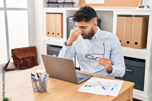 young, hispanic, man, male, guy, beard, adult, person, portrait, photogenic, problem, worry, stress, stressed, unhappy, worried, cephalalgia, business, work, men at work, working, success, manager, boss, employee, elegant, job, table, desk, businessman, laptop, computer, cyberspace, document, paperwork, sitting, clipboard, checklist, goggles, technology, office, workplace, indoor, indoor, interior, room, background