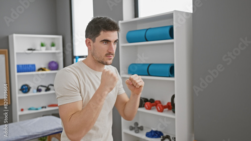Young hispanic man posing confidently in a rehabilitation clinic's gym, showcasing a healthy lifestyle indoors.