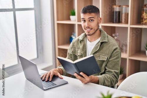 Young hispanic man sitting on table studying at home