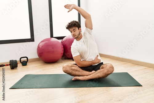 young, hispanic, man, male, guy, adult, person, portrait, photogenic, beard, lifestyle, expression, fitness, fit, training, sport, sporty, activewear, exercise, physical exercise, body, healthy, health, care, gym, athletic, athlete, yoga, mat, stretch, stretching, strenght, serious, condensed, concentration, concentrated, looking, muscle, muscular, center, club, gym, indoor, indoor, interior, room, background