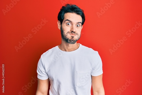 Young hispanic man wearing casual white tshirt puffing cheeks with funny face. mouth inflated with air, crazy expression.