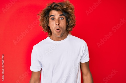 Young hispanic man wearing casual white tshirt scared and amazed with open mouth for surprise, disbelief face