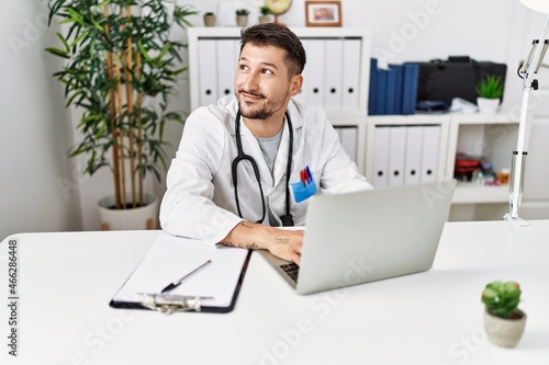 Young hispanic man wearing doctor uniform working at clinic