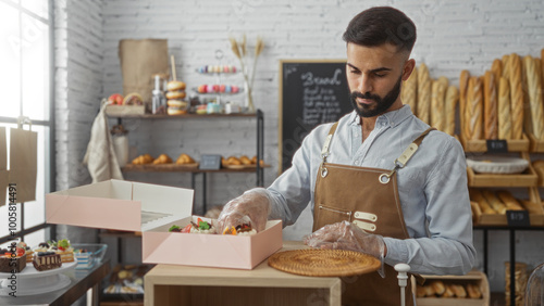 man, hispanic, male, bakery, indoor, shop, beard, photogenic, adult, portrait, apron, cake, glove, prepare, baked, bread, interior, counter, display, baker, dessert, food, men at work, chef, cake, pastry, hand, tasty, treat, fresh, sweet, uniform, retail, profession, business, serving, countertop, client, baking, delicious, box, shopkeeper, store, employee, workspace, service, cardboard box, snack