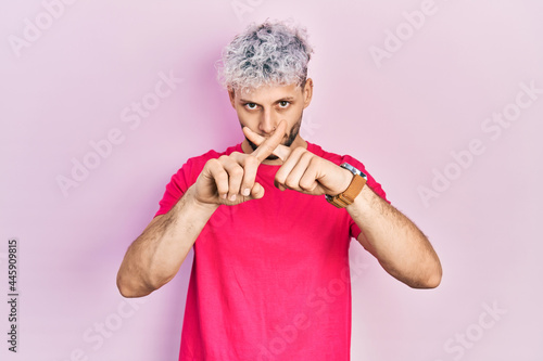 Young hispanic man with modern dyed hair wearing casual pink t shirt rejection expression crossing fingers doing negative sign