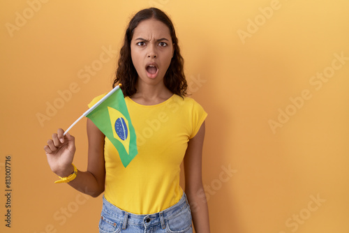 Young hispanic woman holding brazil flag in shock face, looking skeptical and sarcastic, surprised with open mouth