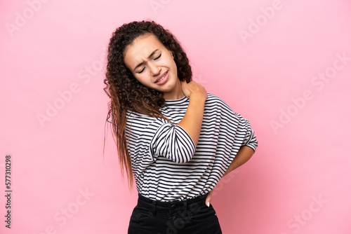 girl, woman, people, person, female, woman, lady, attractive, beauty, pretty, beautiful, youth, young, adult, 1, portrait, brunette, curly, coiffure, background, isolated, wall, colours, colourful, pink, arab, arabic, moroccan, pain, shoulder, muscle, injury, backache, body, ache, health, massage, problem, bruised, injured, painful, suffer, muscular, disease, medicals, suffering, touching, sick, hand
