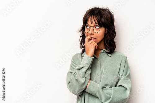 Young hispanic woman isolated on white background relaxed thinking about something looking at a copy space.