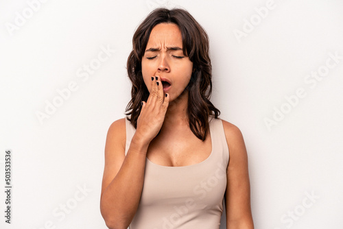 Young hispanic woman isolated on white background yawning showing a tired gesture covering mouth with hand.