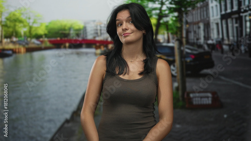 woman, canal, street, hispanic, young, water, city, outdoors, grooved, indifference, apathy, coldness, reserve, female, waterway, bridge, urban, gesture, expression, smirk, cobbled, quay, pavement, embankment, sunlight, boat, car, building, parking, tree, greenery, necklace, earring, tank top, shoulder, hair, skin, urban life, metropolis, sidewalk