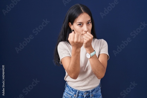 Young hispanic woman standing over blue background ready to fight with fist defense gesture, angry and upset face, afraid of problem