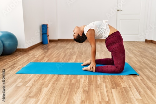 Young hispanic woman training yoga at sport center