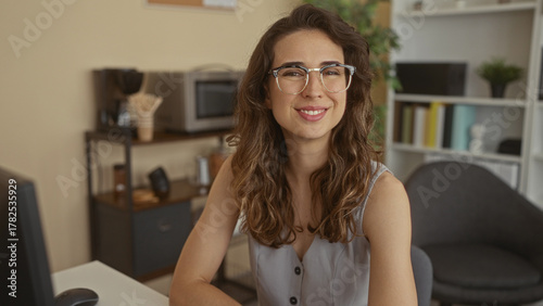 woman, computer, typing, building, hispanic, young, office, indoor, desktop, keyboard, concentration, desk, chair, mouse, screen, display, workstation, technology, female, goggles, eyeglass, spectacle, frame, bookshelf, plant, coffeemaker, microwave, cup, workplace, interior, hardware, software, work, task, business, seat, table, storage, tech, electronic, contraption, equipment, organisation, station, lens, vision, posture, pose