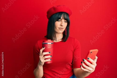 Young hispanic woman using smartphone and drinking a cup of coffee relaxed with serious expression on face. simple and natural looking at the camera.