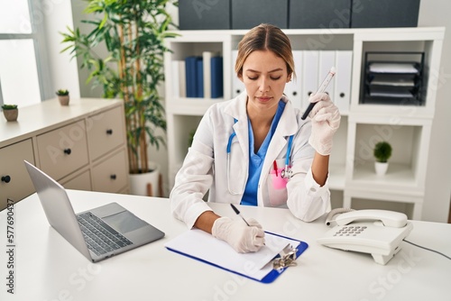 Young hispanic woman wearing doctor uniform analysing blood test tube at clinic
