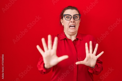Young hispanic woman with red hair standing over red background afraid and terrified with fear expression stop gesture with hands, shouting in shock. panic concept.