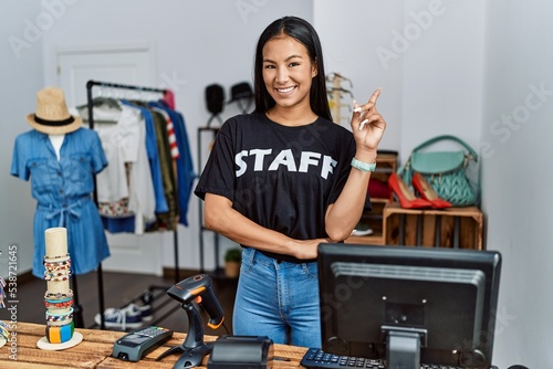 Young hispanic woman working as staff at retail boutique with a big smile on face, pointing with hand finger to the side looking at the camera.
