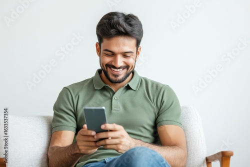 young indian man sitting on sofa and using smartphone