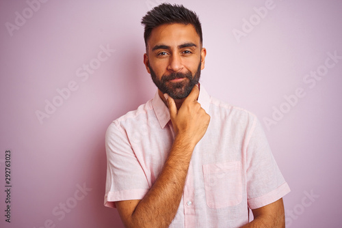 Young indian man wearing casual shirt standing over isolated pink background looking confident at the camera with smile with crossed arms and hand raised on chin. Thinking positive.