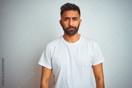 Young indian man wearing t-shirt standing over isolated white background depressed and worry for distress, crying angry and afraid. Sad expression.