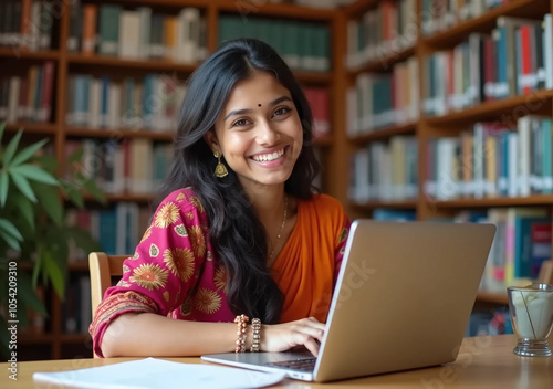 young, indian, woman, studying, laptop, library, book, education, learning, smile, traditional, cultural, student, happy, cognition, bookshelf, writing, academic, orange, saree, sharpened, intelligent, professional, ethnic, modern, technology, workspace, study, research, university, school, lifestyle, indoor, success, confident, friendly, attractive, reading, literature, scholar, fashionable, serene, career, motivation, goal, achievement, empowerment