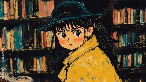 Young investigator in a trench coat and hat, framed by a blurred bookshop background, ideal for narratives with a literary twist