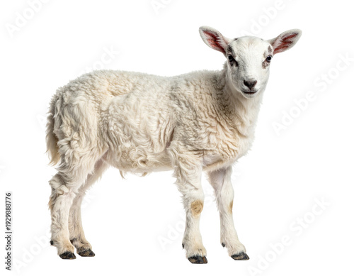 Young lamb standing on white background with fluffy wool and curious expression