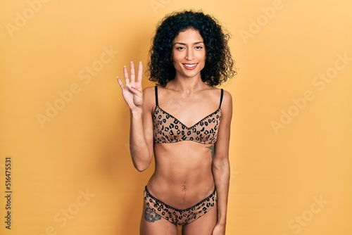 Young latin girl wearing bikini showing and pointing up with fingers number four while smiling confident and happy.