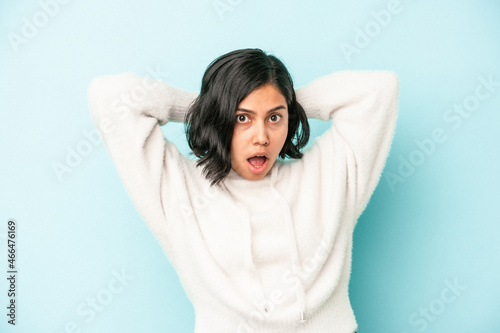 Young latin woman isolated on blue background screaming, very excited, passionate, satisfied with something.