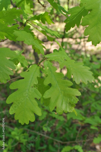 Young leaves close-up on a blurred background. Oak (Latin Quércus) Early spring in the forest.