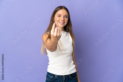 Young Lithuanian woman isolated on purple background doing coming gesture