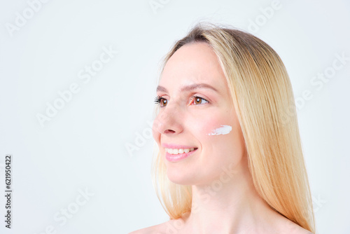young long-haired blonde girl in profile smiling with creams on her face on white background